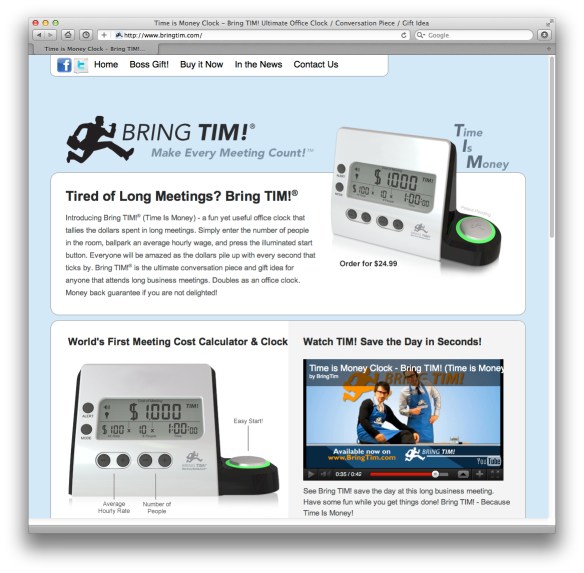 • Layout. In an otherwise perfect site, I noticed that the text layout there’s an odd problem with the font layout for the heading “World’s First Meeting Cost Calculator & Clock” above the product to the left of the video. The text isn’t centered in the area above the product and it almost runs into the gray area above the video. On the Boss Gift page, this isn’t a problem. This really isn’t a usability issue, and most people would not even notice it as a design problem, but it caught my eye.